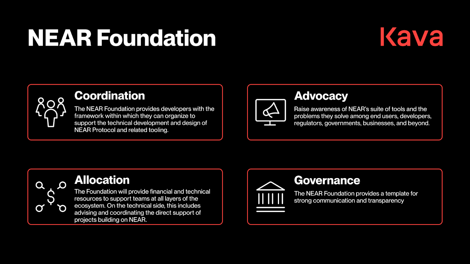 The NEAR Foundation has created a foundation model to address four key areas within blockchain governance: Coordination, Allocation, Advocacy, and Governance. In doing so, they have helped standardize the processes for ecosystem support, developer relations, and strategic initiatives while respecting the community's authority.