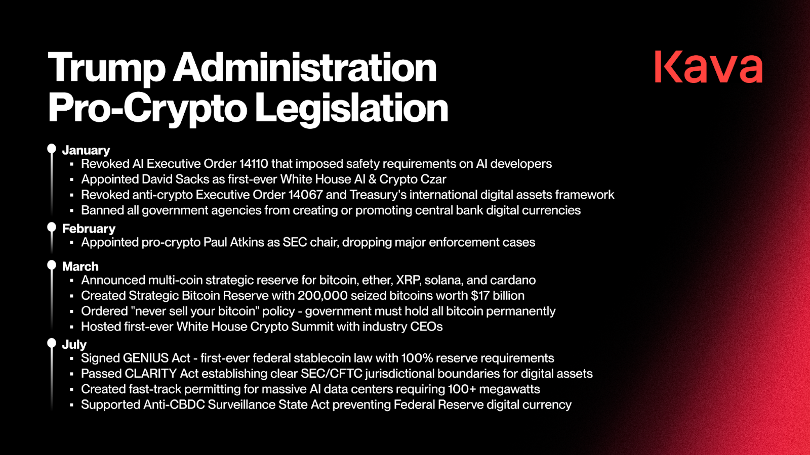 By having an administration commit to and following through with pro-crypto regulation, it creates an environment where domestic projects can plan long-term strategies with the confidence that they will not be targeted or penalized for simply existing. This is a significant advantage over regions that remain in regulatory obscurity or are subject to burdensome administrative oversight policies.