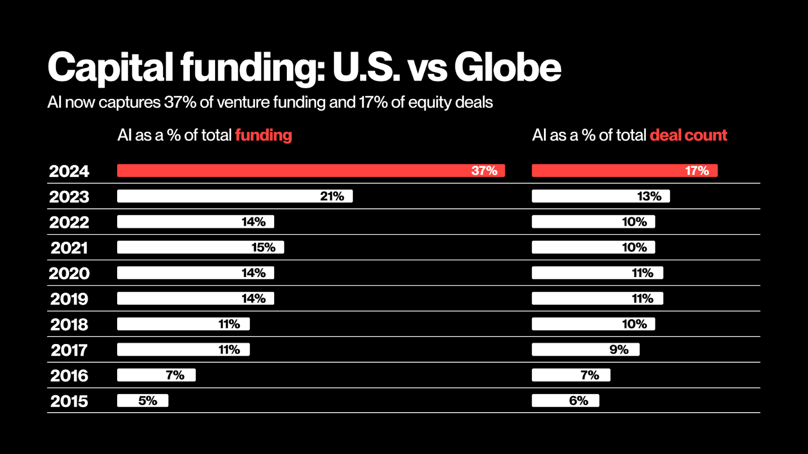 Coinciding with the FTX collapse, AI investment saw a massive surge after the release of ChatGPT3.5 to the public in November 2022, now making up 37% of the total amount of venture funding. This explosion in American VC funding is further accelerated by institutional adoption of innovative technologies. Crypto and AI projects that operate outside of the U.S. not only face significant regulatory hurdles compared to American companies, but with the passage of the Democratizing Access to Alternative Assets for 401(K) Investors Executive Order, they remain locked out of tapping into this massive source of funds.